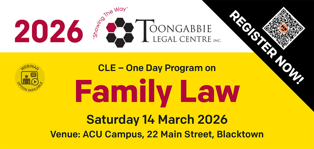 Toongabbie Legal Centre will host a Mandatory Continuing Legal Education seminar (MCLE) on Saturday 14 March 2026 that is designed to support the continuing professional development of legal practitioners (solicitors and barristers). The session will support the development of legal knowledge and practical skills. It aims to promote reflective practice, strengthen professional competence, and support practitioners in meeting their ongoing CLE obligations.